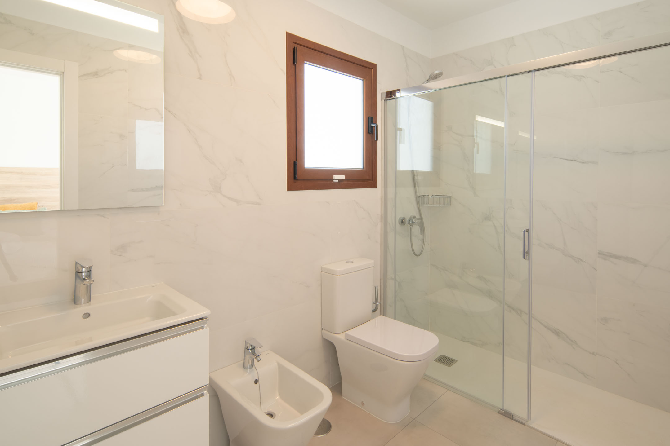 La villa dispone también de tres baños completos, ambos con ducha y acabados en tonos claros, donde la simplicidad y la limpieza visual acompañan el confort. Todo está pensado para que cada rutina —desde una ducha a media tarde hasta prepararse para dormir— se sienta ligera y fluida.